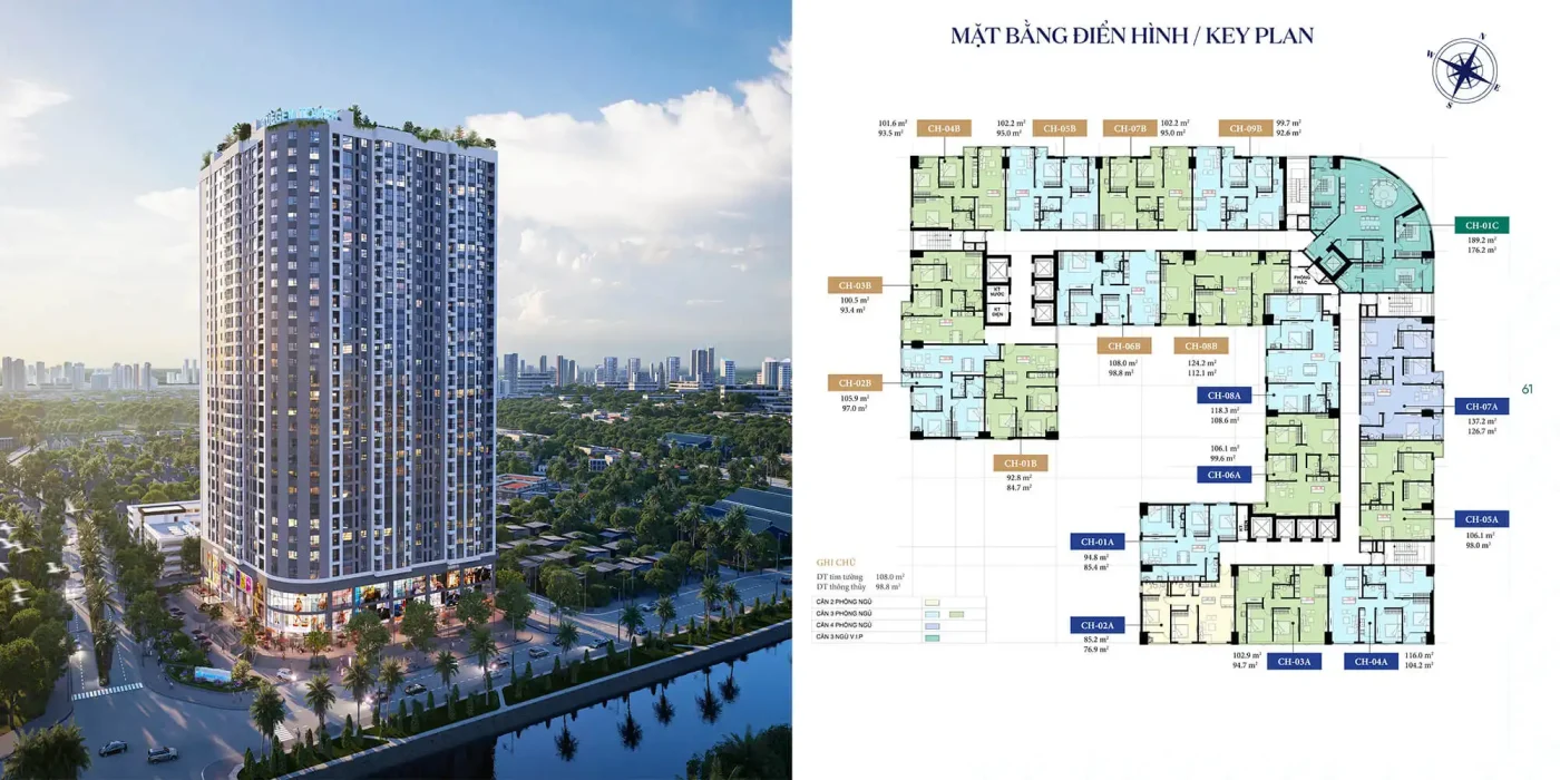 - Căn hộ đa dạng diện tích từ 2,3,4 Phòng ngủ, diện tích từ 76,9 – 179m².